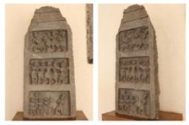 | Description / विवरण | Inscribed Viragal slab with three sculptured panels illustrate voluntary immolation of a Hero by fire representing the hero seated with folded hands amidst the flames. Musician on the left side and a person in an adoring attitude accompany the act of self immolation. In the middle panels the hero is being lifted to heaven by four apsaras celestial damsels , two of them have chamaras in their hands. The upper most panel depicts the hero on his way to heaven on horseback in place of his usual seat in heaven. The top portion of the slab replicates a two tiered south Indian temple sikhara superstructure . |