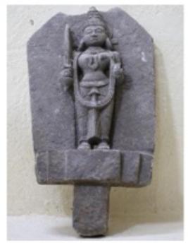 | Description / विवरण | Highly embellished image of a Dwarapalika female gatekeeper on guard. The deity is holding a sword in her right hand and bowl in left hand. She is wearing elaborate neck ornament, Jatamukuta and garland. The conical topping of the slab is broken.She wears a dress of fine drapery. |