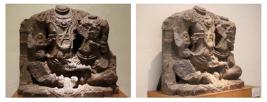 | Description / विवरण | Ornamented, headless, relief of lakshminarayana image mutilated seated in abida folded legs with feet touching each other posture. Lakshmi is seated on the lap of her spouse. The couple is emracing each other Both the deities are depicated with elaborate ornamentation. Heads and hands of the deities are broken and attributes are lost. |