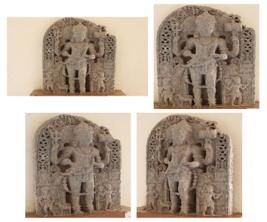 | Description / विवरण | Stone image of a standing four handed Bhairava, holding clockwise , i broken ii Trisula iii Damaru iv broken. The Deity is flanked by two attendants; the one on the right holding a bow in hand is accompanied by a dog which wears a garland of skulls. The slenderly carved, proportionate sculpture is bordered by a torana foliage decoration. |
