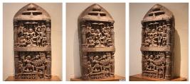 | Description / विवरण | Finely carved Viragal of Hero stone commemorating the death of hero in a navale battel. The hero is shown as rising from the ground or water and charging the enemy on a vesssel with a dagger, and the latter is charging the former with spear. The upper panel depictes the heros enthronement in heavn, flanked by a mob of apsaras two of them are holding a parasol over his head and two flanking apsaras on either side of him are fanning him with chamaras fly whisks |