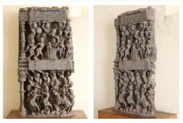 | Description / विवरण | Inscribed viragal or hero stone sculpted in bold relief and flanked by replicas of slender pillars. The hero is represented as fighting against his enemies in two panels- in the lower panel on horseback and in the middle panel he is being slain by his enemies on the wall of a rampart which is plastically positioned. Theh uppermost panneldepicating the hero s usual seat in heaven is broken. |
