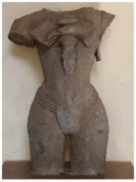 | Description / विवरण | Broken sculpture of a warrior; head, hands and portion below the hip are - broken and missing. His hands placed one over the other rested on the - handle of a sword including Sours his chest and resting on a support. The warrior is depicted with minimum dress code of a kampina held by three str- anded girdles around his waist. |