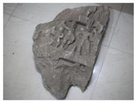 | Description / विवरण | Mutilated viragal hero stone with three defaced human figure; two large sized figures are raising their right hands in an attitude of blessing and the third figure of much smaller size is folding hands in obediance. |