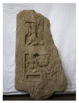 | Description / विवरण | Mutilated virakal or hero stone sculpted from crude basalt. Portions of two panels are visible. In the lower panel a female dancer is deicing on a raised platform; other figures are broken. In the upper panel a vidhyadhara figure is holding a garland of flowers; the figure adjacent to it are broken. |