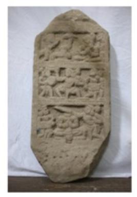 | Description / विवरण | Complete viragal hero stone representing the immolation of a hero by his decapitation. The lowermost panel plastically represents the decapitation; the hero is seated cross legged on a throne; his hands are folded in gesture of prayer; although his head has already been cut off and is shown in front of his throne, a person on his proper right side is seen with a raised sword in his hand as if about to cut the head off. Another person in the rig- ht corner is depicated playing a drum. The middle panel depicts the dead hero on his way to heaven flanked by musicians who are playing drum and gong. The third panel illustrates the hero worshipping a shivalinga in heaven, flanked by two persons who are assisting him. |