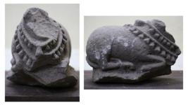 | Description / विवरण | Headless ornamented seated sculpture of nandi in basalt stone wearing two garlands of small bells around its neck. |