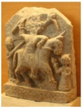 | Description / विवरण | Image of warrior Kulapurusa riding on a horse; he is depicted as fighting - against enemy protected under a parasol. Two persons are depicated as attending him on ground with a parasol and a chamara flywhisk . His he- ad is damaged beyond Type Of Object. |