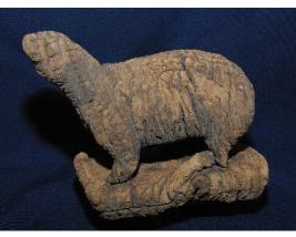 | Description / विवरण | Lamb like Four leg Animal .behind legs bent no tail raised head sitting over pedestal. |