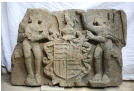 | Description / विवरण | Coat of Arms either side two figure of angels standing and in the centrer figure with two different symbol are visible. |