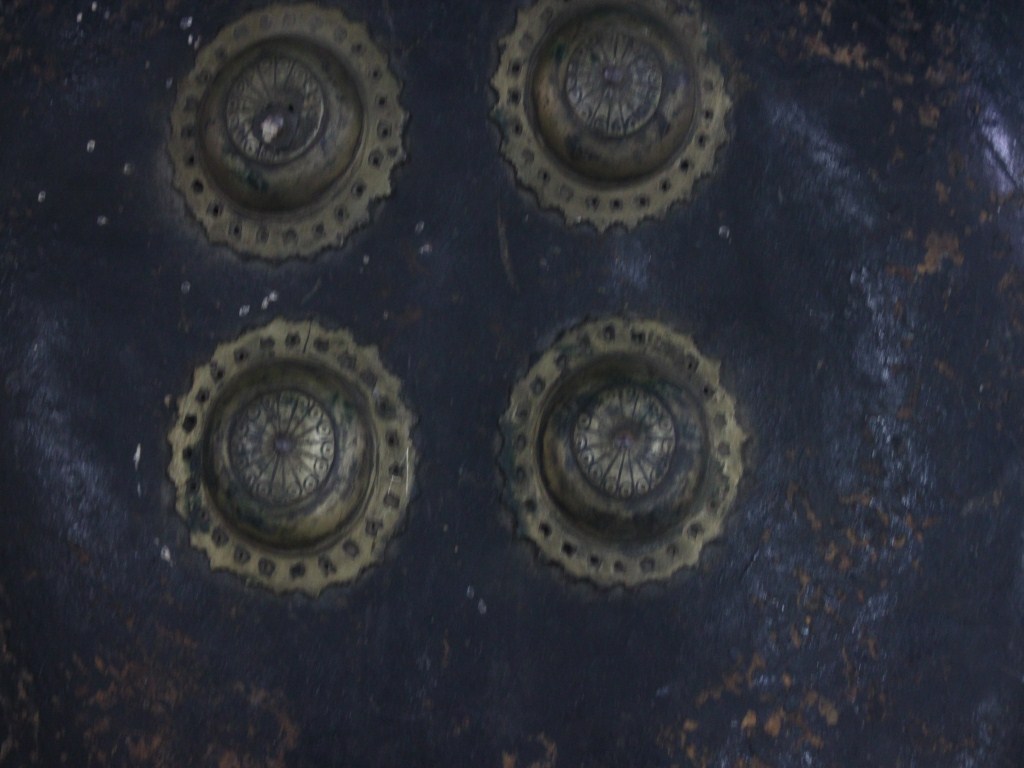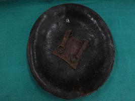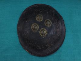 A medium, circular and slightly convex shield of iron alloy. There are four small gilded knobs in the center and the back side of is padded between the knobs. Front is badly rusted and the edges are rough. Back is also polished in black colour and there is some rusting.