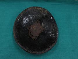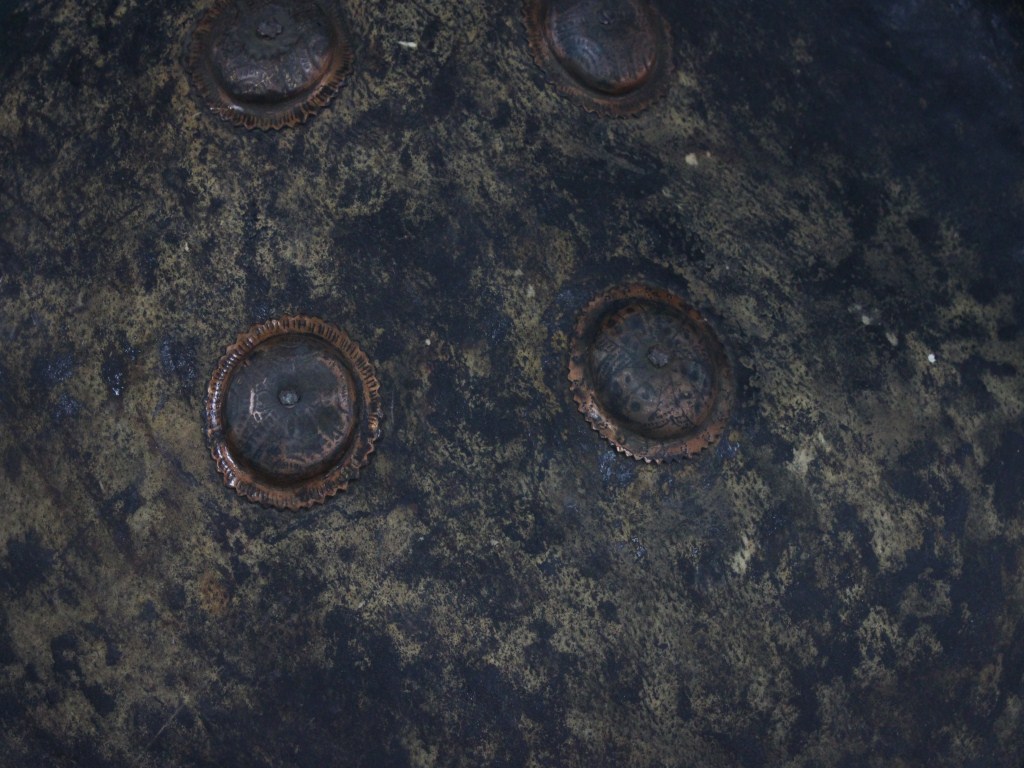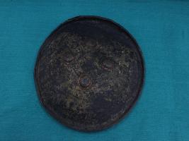 A medium, circular and slightly convex shield of iron alloy. There are four small gilded knobs in the center and the back side of is padded between the knobs. Front is badly rusted and the edges are rough. Back is also polished in black colour and there is some rusting.