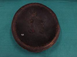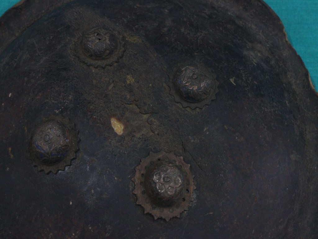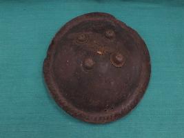A medium, circular and slightly convex shield of iron alloy. There are four small gilded knobs in the center and the back side of is padded between the knobs. Front is badly rusted and the edges are rough. Back is also polished in black colour and there is some rusting.