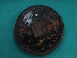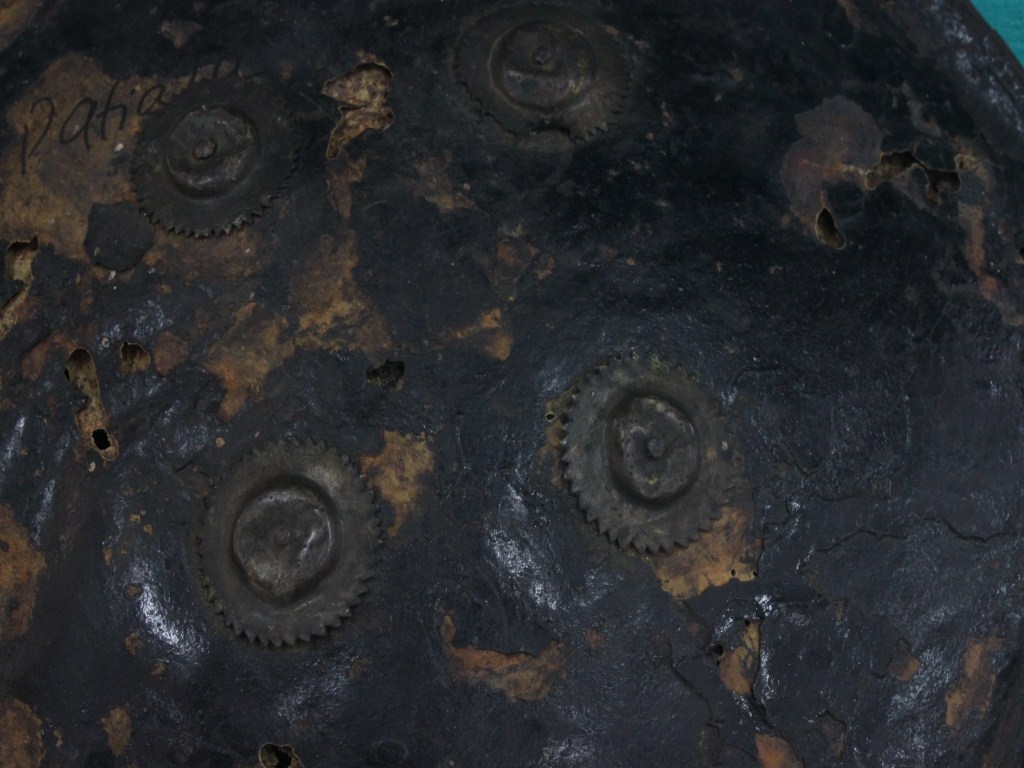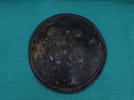 A medium, circular and slightly convex shield of iron alloy. There are four small gilded knobs in the center and the back side of is padded between the knobs. Front is badly rusted and the edges are rough. Back is also polished in black colour and there is some rusting.
