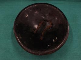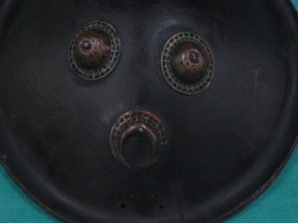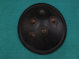 A medium, circular and slightly convex shield of iron alloy. There are four small gilded knobs in the center and the back side of is padded between the knobs. Front is badly rusted and the edges are rough. Back is also polished in black colour and there is some rusting.