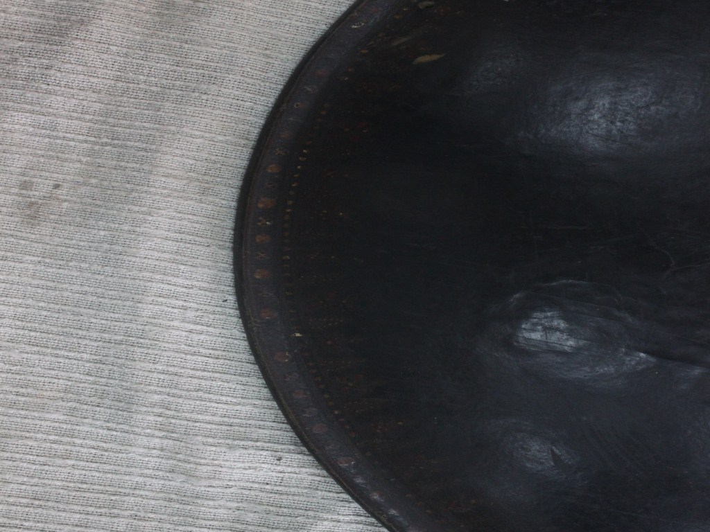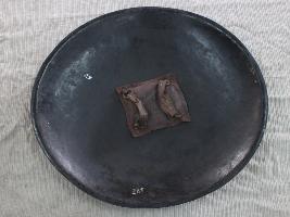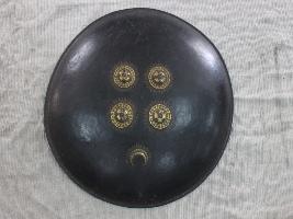 A medium, circular and slightly convex shield of iron alloy. There are four small gilded knobs in the center and the back side of is padded between the knobs. Front is badly rusted and the edges are rough. Back is also polished in black colour and there is some rusting.