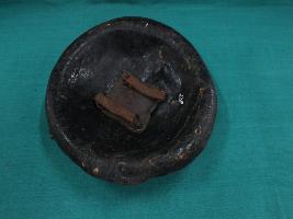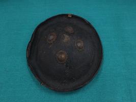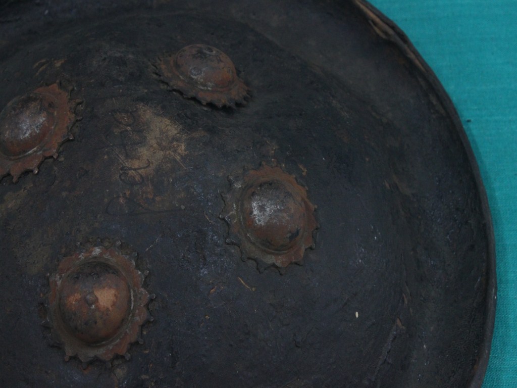A medium, circular and slightly convex shield of iron alloy. There are four small gilded knobs in the center and the back side of is padded between the knobs. Front is badly rusted and the edges are rough. Back is also polished in black colour and there is some rusting.