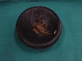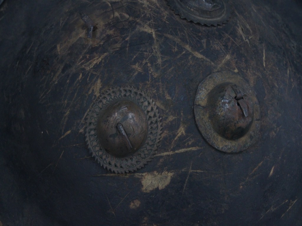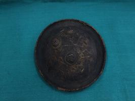 A medium, circular and slightly convex shield of iron alloy. There are four small gilded knobs in the center and the back side of is padded between the knobs. Front is badly rusted and the edges are rough. Back is also polished in black colour and there is some rusting.