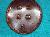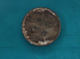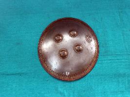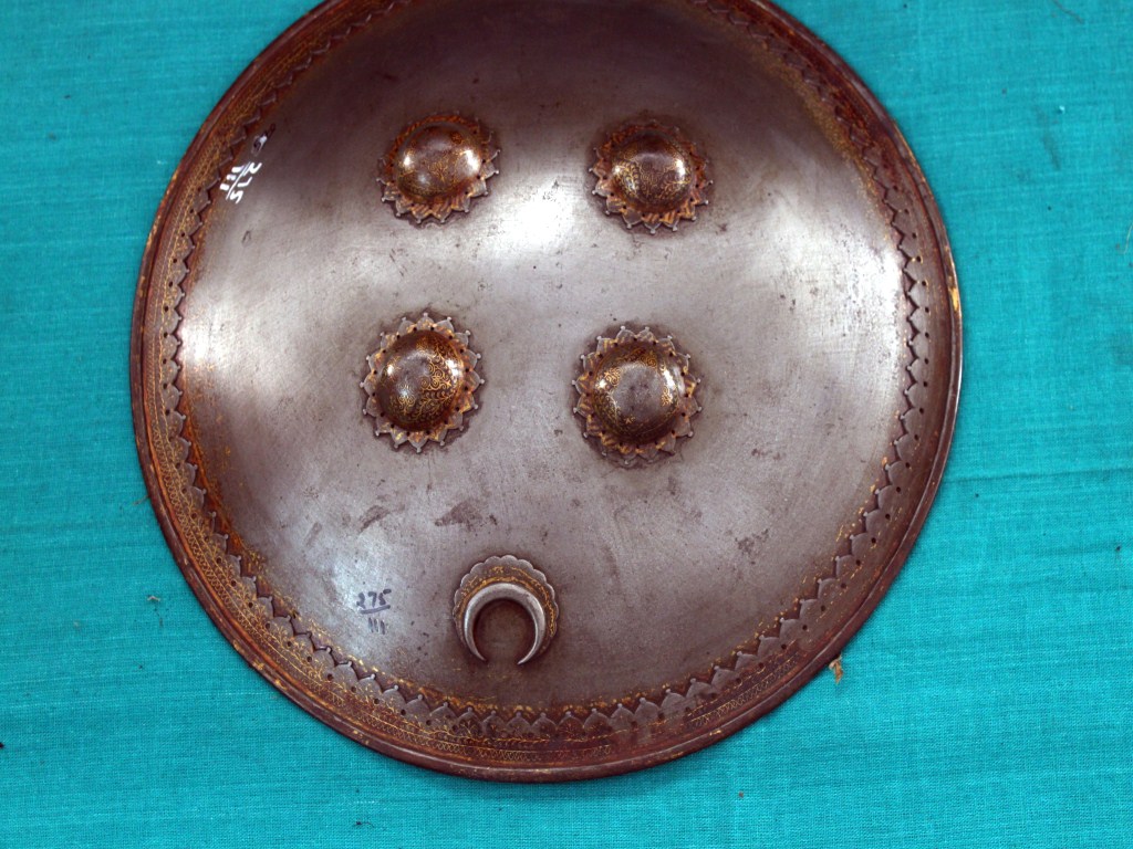 A medium, circular and slightly convex shield of iron alloy. There are three small gilded knobs in the center and the back side of is padded between the knobs but it is damaged. Front is rusted and the edges are rough. Back side is padded.