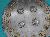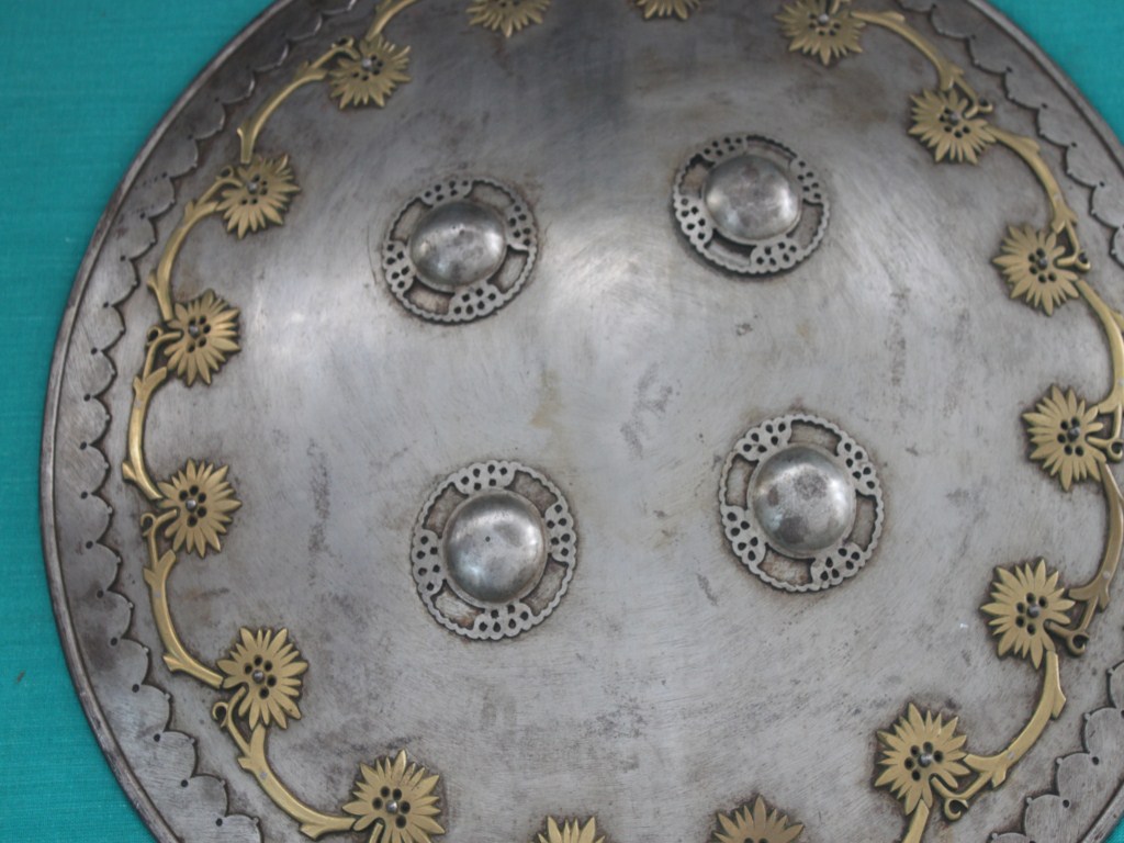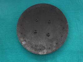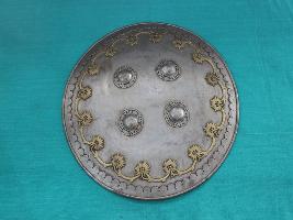 A medium, circular and slightly convex shield of iron alloy. There are four small gilded knobs in the center and the back side of is padded between the knobs but it is missing. Front is ornamented with four knobs and the rim is ornamented with inlaid work. Back is polished in black colour and there is some rusting.