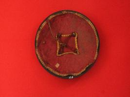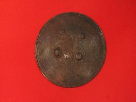 | Description / विवरण | It is a shield made of iron and used in battles. Outer surface is casted with floral designs. There are four knobs on the outer surface which are also casted. Inner surface is covered with cloth. There is a cotton pad in the center with four strings and loops to hold the shield. |