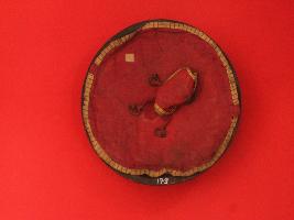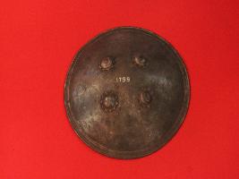 | Description / विवरण | It is a shield made of iron and used in battles. Outer surface is casted with floral designs. There are four knobs on the outer surface which are also casted. Inner surface is covered with cloth. There is a cotton pad in the center with four strings and loops to hold the shield. |