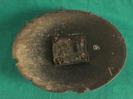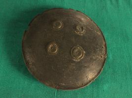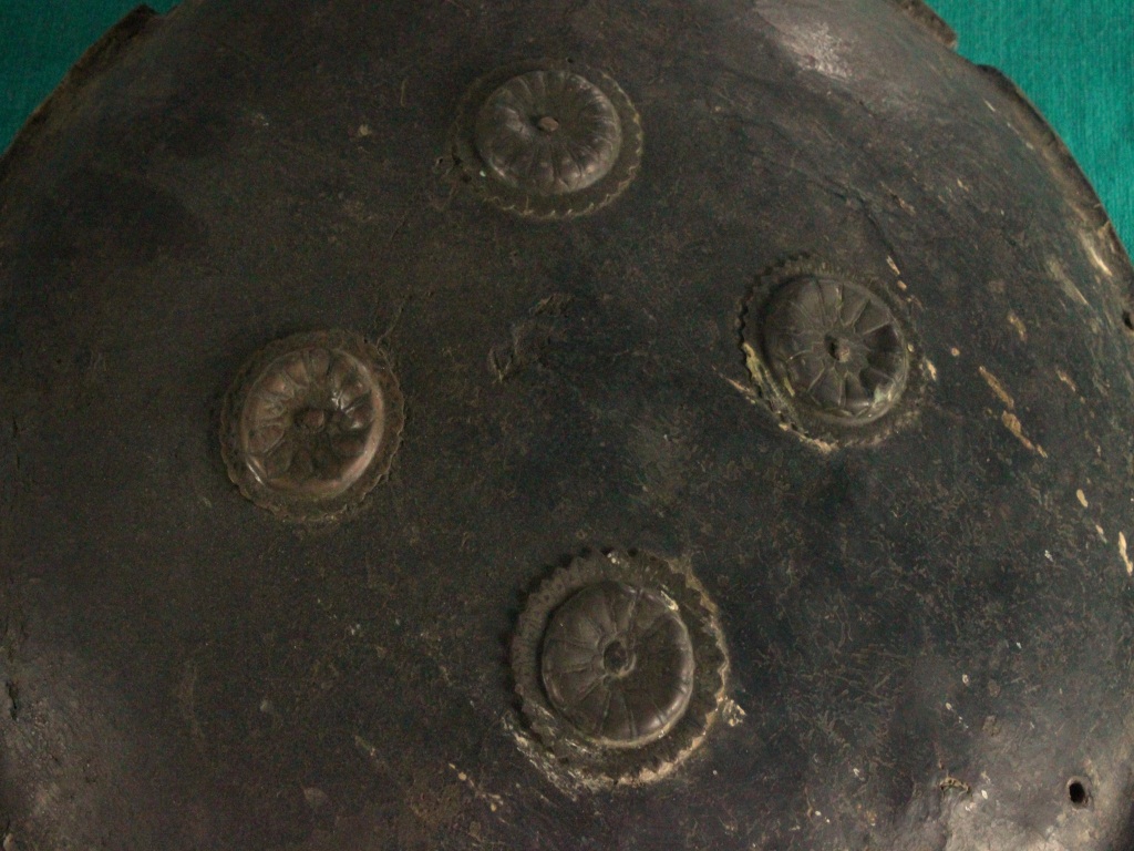 Shield is made of leather that has four metallic cup shaped nail holder on the front side that turns into grip holder from the inside of the shield. Leather is in good condition and well shaped. Peripherae has a minimal margin curved outside. Sheild has no damascation on the upper side while beneath it has a leather and jute padding.