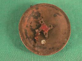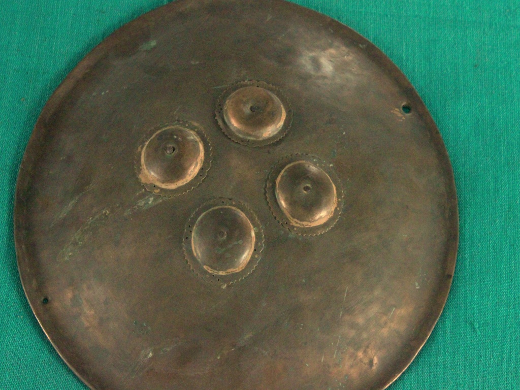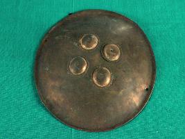 Shield is made of metal that has four metallic cup shaped nail holder on the front side that turns into grip holder from the inside of the shield. Leather is in good condition and well shaped. Peripherae has a minimal margin curved outside. Sheild has no damascation on the upper side while beneath it has a cloth and jute padding.