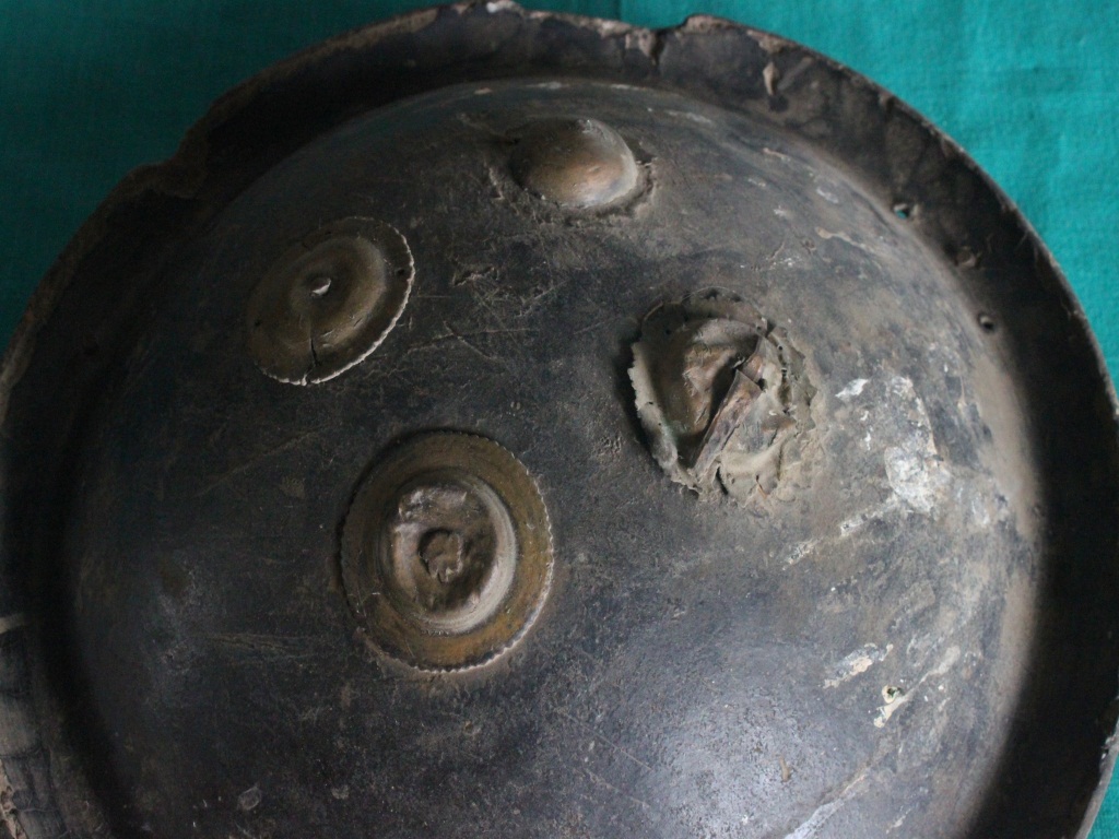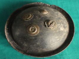 Shield is made of leather that has four metallic cup shaped nail holder on the front side that turns into grip holder from the inside of the shield. Leather is in good condition and well shaped. Peripherae has a minimal margin curved outside. Sheild has no damascation on the upper side while beneath it has a leather and jute padding.