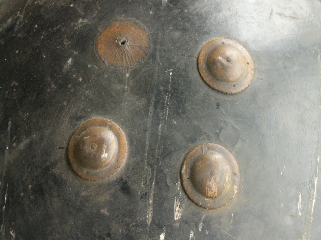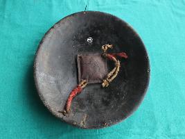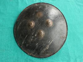 Shield is made of leather that has four metallic cup shaped nail holder on the front side that turns into grip holder from the inside of the shield. Leather is in good condition and well shaped. Peripherae has a minimal margin curved outside. Sheild has no damascation on the upper side while beneath it has a leather and jute padding.