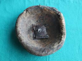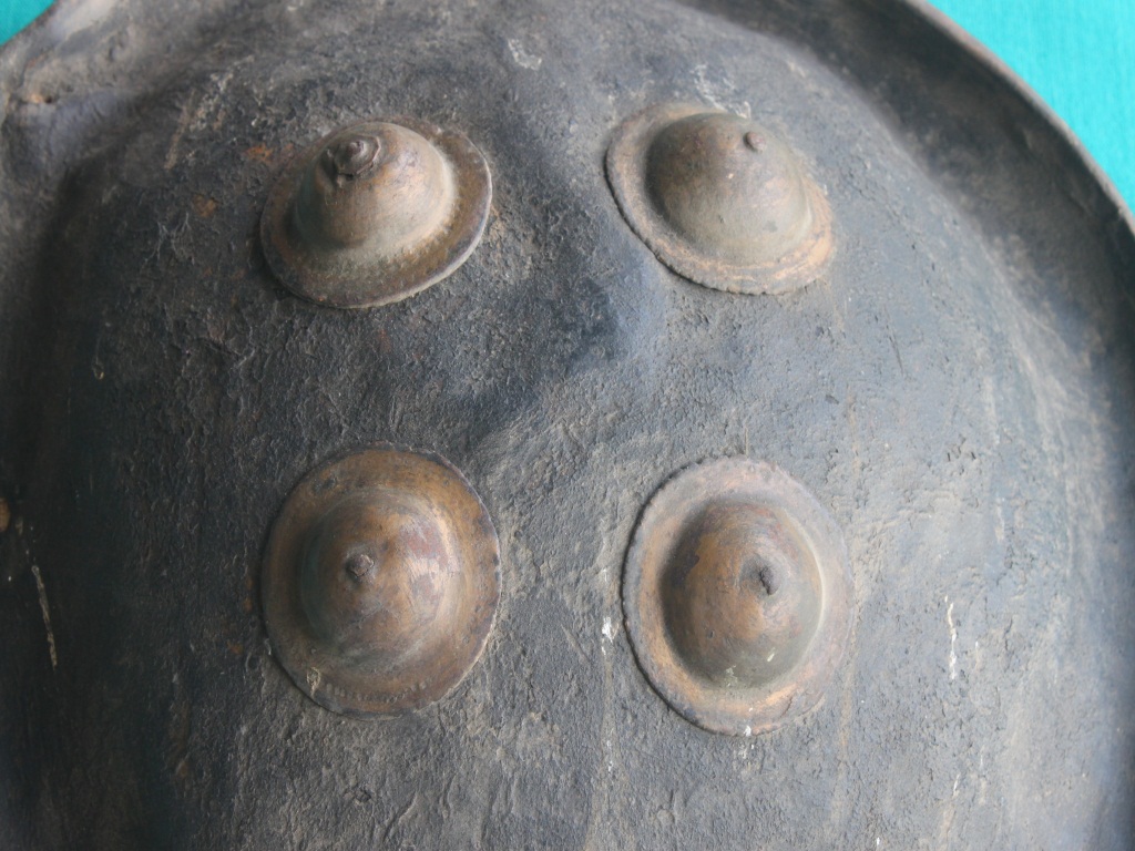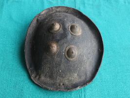 Shield is made of leather that has four metallic cup shaped nail holder on the front side that turns into grip holder from the inside of the shield. Leather is in good condition and well shaped. Peripherae has a minimal margin curved outside. Beneath side it has a cloth and jute padding.