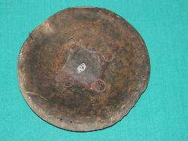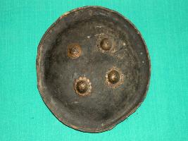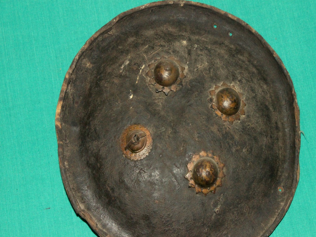 This is a leather shield having four knobs of floral design over upper surface. Peripherae of the shield has marginal upfold. Condition of the leather is good but has some cracks. Pad on beneth side is absent.