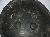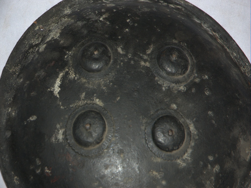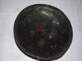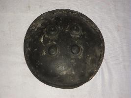 This is black, round shaped shield made of iron. There are four circular metallic knobs affixed on the outer surface. The borders are damaged.
