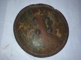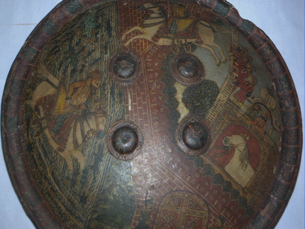 This is a round shaped shield made of iron, wood and leather. There are four circular metallic knobs affixed on the outer surface. The outer surface is beautifully decorated with paintings.