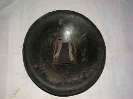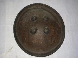 This is circular convex shield of rhinoceros hide.There are four circular iron knobs affixed on the outer surface with strings. There is a leather pad in the middle of the inner surface.