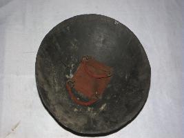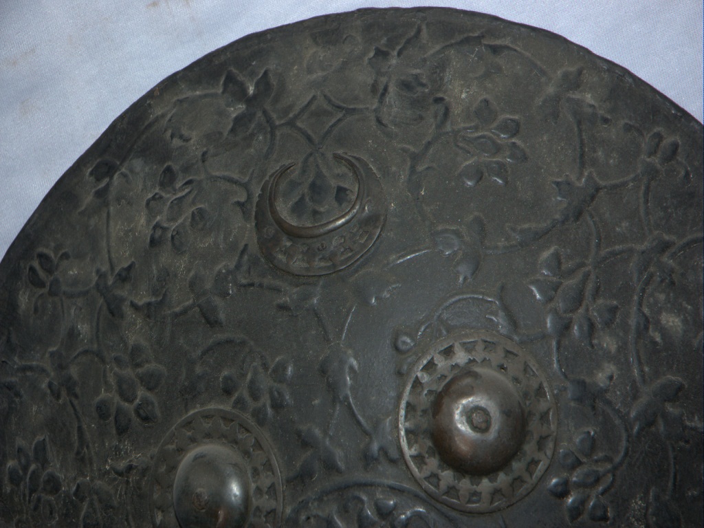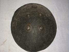 This is a round shaped shield made metal alloy. There are four circular iron knobs affixed on the outer surface. The outer surface has some floral designs and also a horse shoe plate on it.