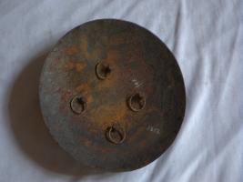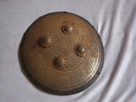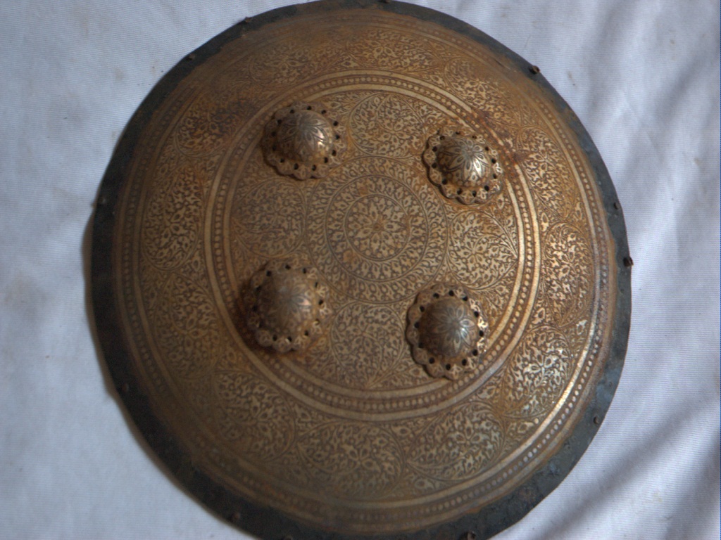 This is large, circular and slightly convex shield of iron.There are four circular iron knobs affixed on the outer surface with iron loops holding it from inner side. There is gold damascened on the outer surface.