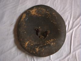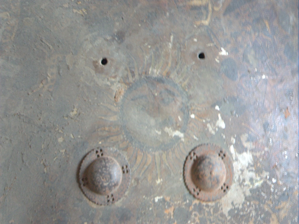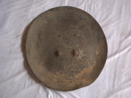 This is large, circular and slightly convex shield of iron.There are two circular iron knobs affixed on the outer surface and its two knobs are missing.The corners are damaged and the shield is rusted.