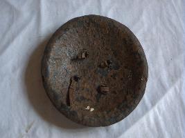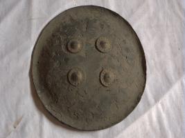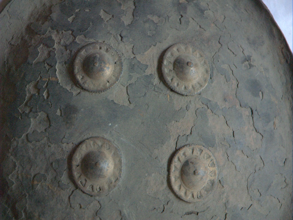 This is a large and deshaped shield made of iron.There are four iron knobs affixed on the outer surface with iron loops holding it from inner side.