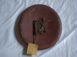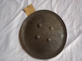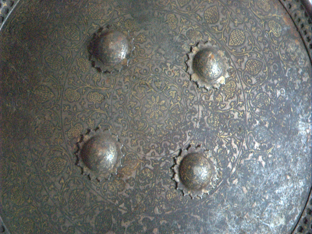This is a shield made of iron.There are four round shaped iron knobs with a zigzag design around it, affixed on the outer surface. There is a gold damascened on the shield with decorative borders. There is a leather pad in the middle of the inner side of the shield.