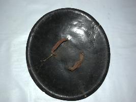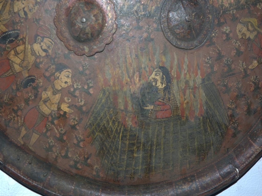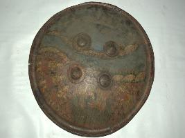 It is a shield with painting of figures on the outer-side along with four knobs thrusting out in the centre. Handle is at the back and it is broken. Back side is plain.