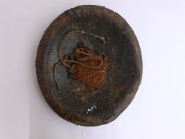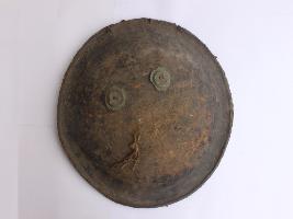 | Description / विवरण | A medium, circular and slightly convex shield of iron alloy. There are two small gilded knobs in the center and the back side of is padded between the knobs but it is damaged and grip is intact. Front is badly rusted and the edges are rough. Back is also polished in black colour and there is some rusting. |