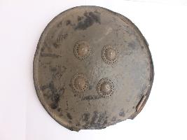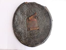 | Description / विवरण | A medium, circular and slightly convex shield of iron alloy. There are four small gilded knobs in the center and the back side of is padded between the knobs. Front is badly rusted and the edges are rough. Back is also polished in black colour and there is some rusting. |