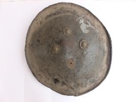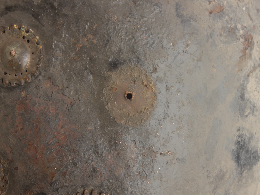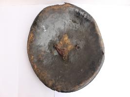 A medium, circular and slightly convex shield of iron alloy. There are three small gilded knobs in the center and the back side of is padded between the knobs but it is damaged and grip is damaged. Front is badly rusted and the edges are rough. Back is also polished in black colour and there is some rusting.