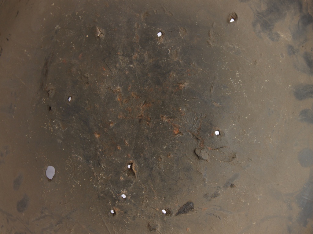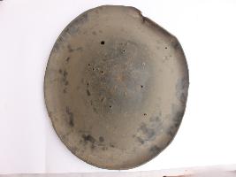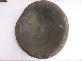 A medium, circular and slightly convex shield of iron alloy. But knobs and pad is missing. Front is badly rusted and the edges are rough. Back is also polished in black colour and there is some rusting.