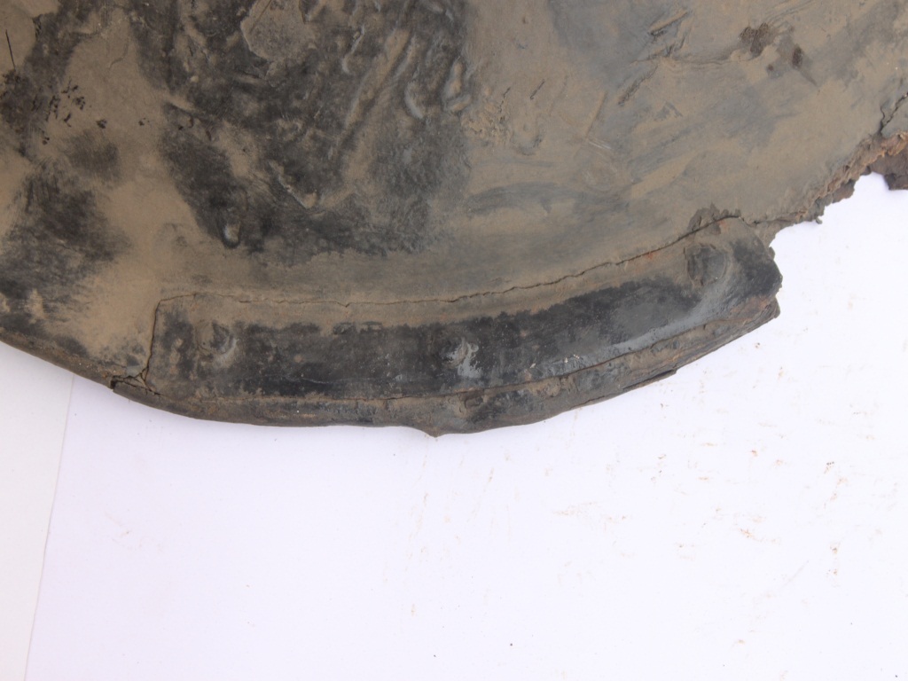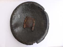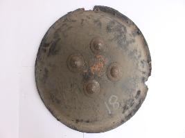 A medium, circular and slightly convex shield of iron alloy. There are four small gilded knobs in the center and the back side of is padded between the knobs. Front is badly rusted and the edges are rough. Back is also polished in black colour and there is some rusting.