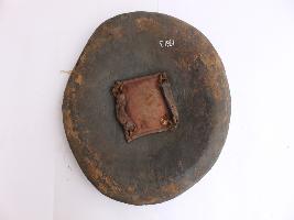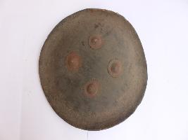 | Description / विवरण | A medium, circular and slightly convex shield of iron alloy. There are four small gilded knobs in the center and the back side of is padded between the knobs. Front is badly rusted and the edges are rough. Back is also polished in black colour and there is some rusting. |