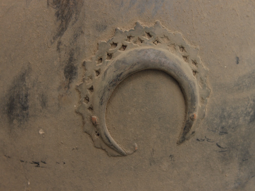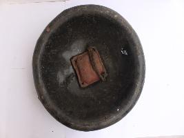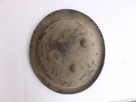 A medium, circular and slightly convex shield of iron alloy. There are two small gilded knobs in the center and the back side of is padded between the knobs but it is damaged and grip is intact. Front is badly rusted and the edges are rough. Back is also polished in black colour and there is some rusting.