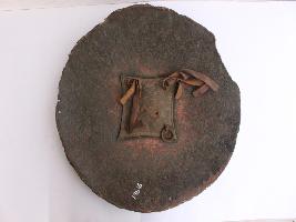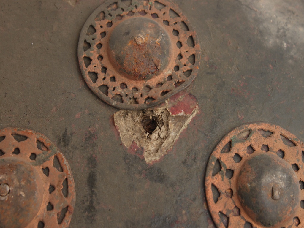 A medium, circular and slightly convex shield of iron alloy. There are four small gilded knobs in the center and the back side of is padded between the knobs. Front is badly rusted and the edges are rough. Back is also polished in black colour and there is some rusting.