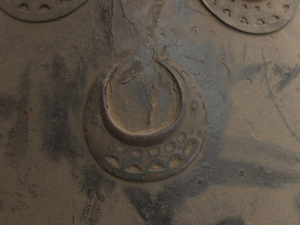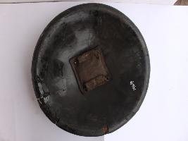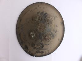 A medium, circular and slightly convex shield of iron alloy. There are four small gilded knobs in the center and the back side of is padded between the knobs. Front is badly rusted and the edges are rough. Back is also polished in black colour and there is some rusting.